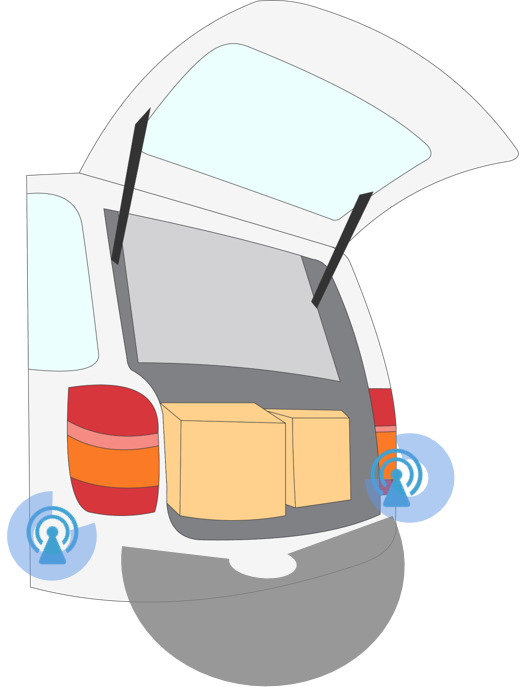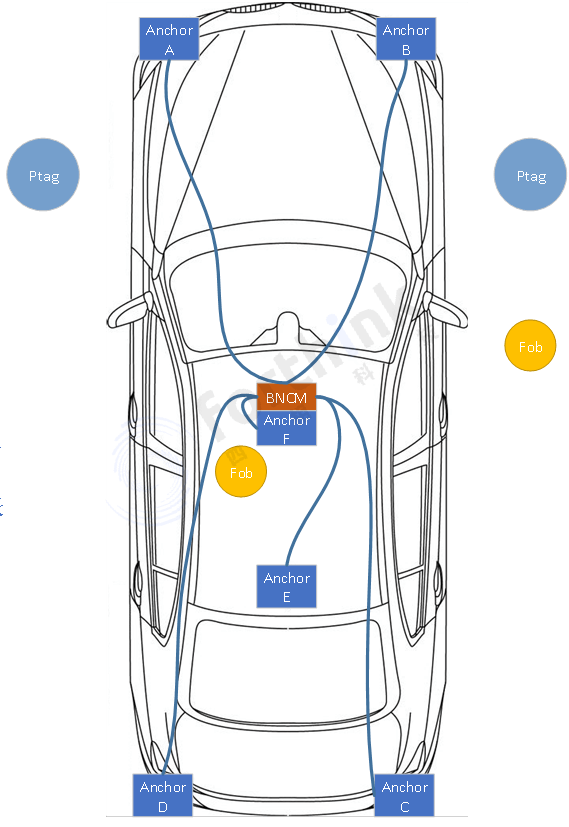 汽車端共部署6個Anchor(UWB定位錨點),協(xié)同BNCM(車載位置解算模塊),精準定位KeyFob(手機或?qū)嶓w車鑰匙)相對于車輛的位置,實現(xiàn)解閉鎖、迎賓等應(yīng)用。